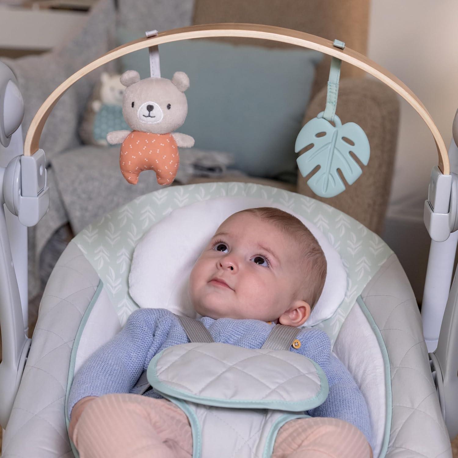 Your newborn can swing or sit in comfort with the Raylan ConvertMe Swing-2-Seat from Ingenuity. When your infant wants to sway, the automatic swing setting will calm and comfort. Quickly and easily convert it into a stationary seat with our secure EasyLock system. In either mode, baby can enjoy soothing vibrations. This travel friendly baby swing features a foldable design so it can lay flat for easy storage and portability. Soothe your little one with 5 swing settings, 12 melodies and 4 nature sounds or keep him entertained with plush bear toy included. When you need to scoop up your baby, our innovative leaf-shaped toy bar easily pivots out of the way. Power the swing motion and music with a USB cord (included), while 1 C battery powers the vibration unit. Batteries not included. When things get messy, remove the machine washable seat pad and headrest for easy cleaning. With a gender neutral design, this swing makes a great baby shower gift idea for boy or girl. This compact and take along swing-to-seat is ready for the ride wherever you need to go. Use from age 0 to 9 months or up to 20 lbs.