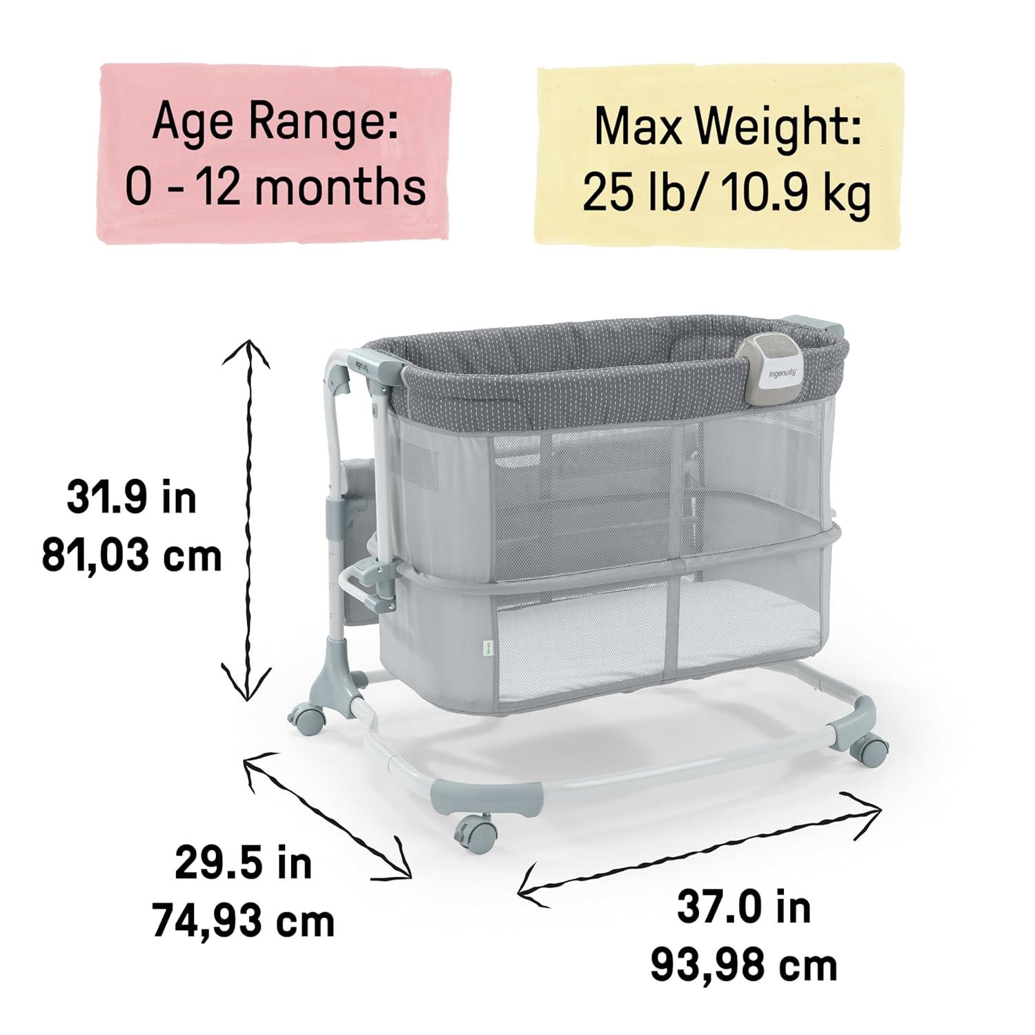 You and baby can both sleep easy with a safe and comfortable environment that lasts through their entire first year. The Ingenuity Dream Hero 3-in-1 Co-Sleeping Bassinet keeps baby right by your side for more peaceful nights. With 3 modes of use, you can easily convert this baby bed from bedside sleeper to bassinet to crib as your little one grows. Use the 4 height adjustments to accommodate the height of your bed, making it easier to reach and respond to your baby through the night. The breathable mesh sides allow more airflow and visibility. Whether keeping baby in your room or moving them to the nursery, you can lower the mattress to extend the use of your bassinet up to 12 months. Music and white noise help soothe your baby. Includes a soft night light to check on baby. This smart design is versatile enough for your baby’s use for up to a year. Move the Dream Hero from room to room with wheels that lock securely in place. Mattress is designed with the right firmness for baby & mattress pad is washable. Includes 1 machine washable sheet. Dimensions: 27.8″ (H) x 29.9″ (W) x 27.2″ (D)
