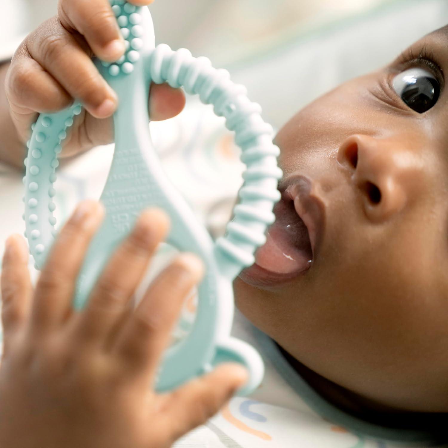 As soon as baby starts cutting those first teeth, the Ingenuity™ Gum Buddies™ Teether 2-Pack can help soothe the soreness away. Silicone bristles and a textured surface on the rings help to massage baby’s gums. The ergonomic design is easy for little hands to grasp. Aesthetically pleasing, gender neutral colors with a lamb and bear shape make this set great for gifting. Made from BPA-free silicone, the soothing materials are safe for baby’s mouth and easy to clean. With 2 pieces per pack, you can keep one at home and another in the diaper bag for on-the-go teething relief.