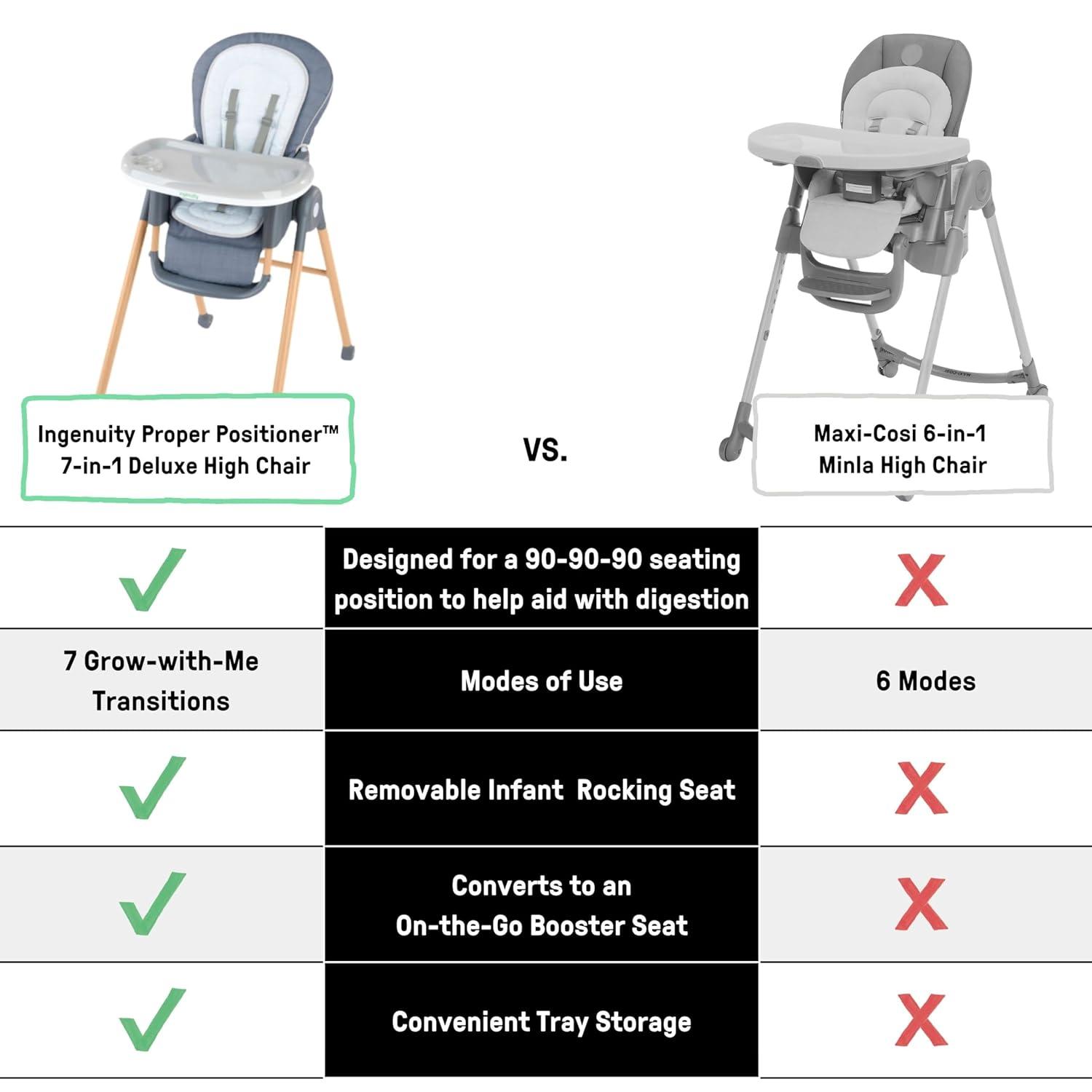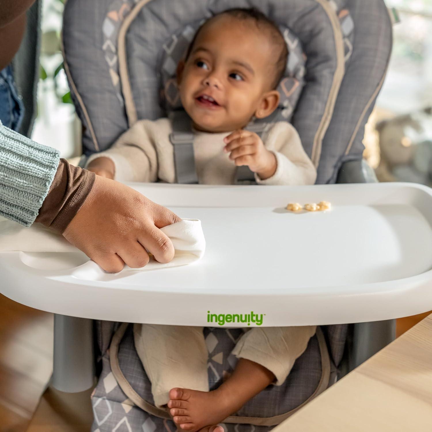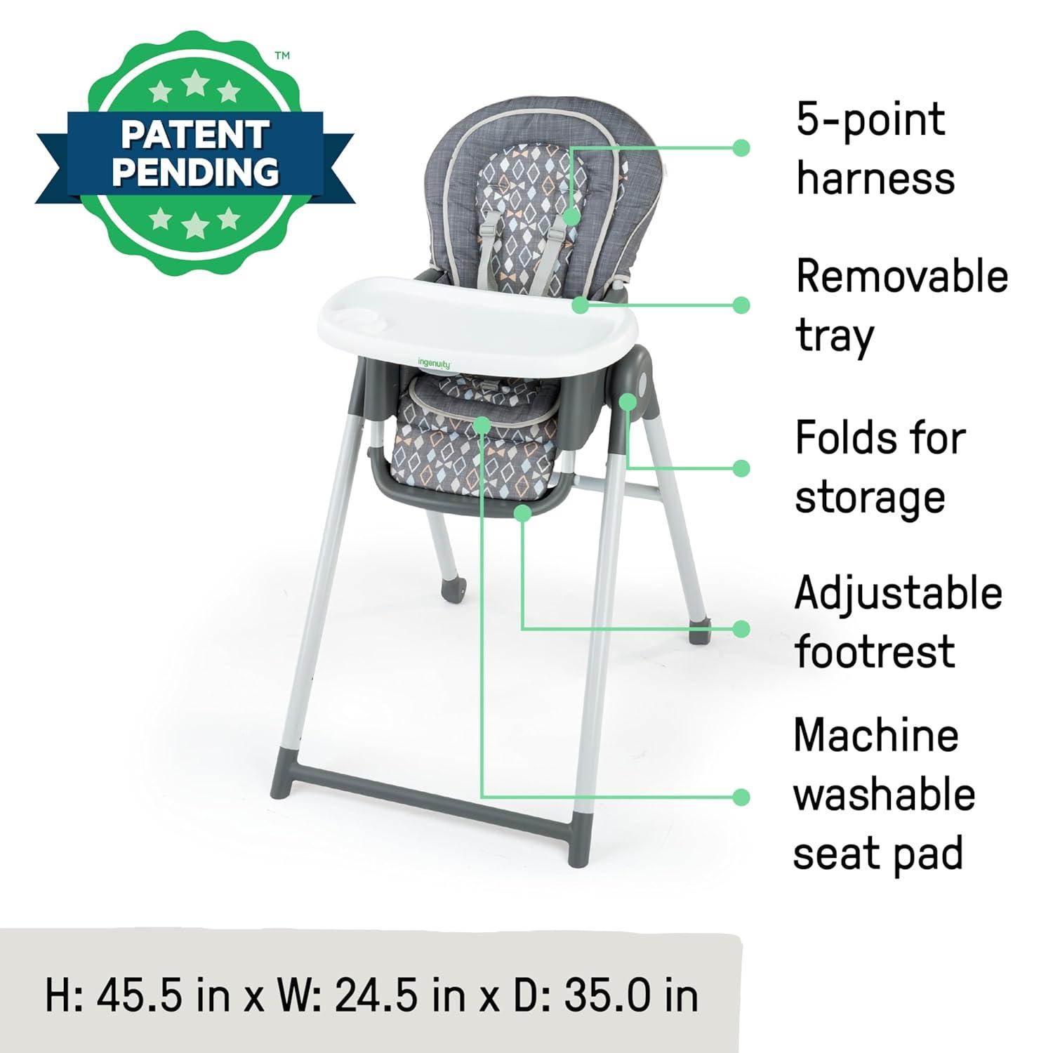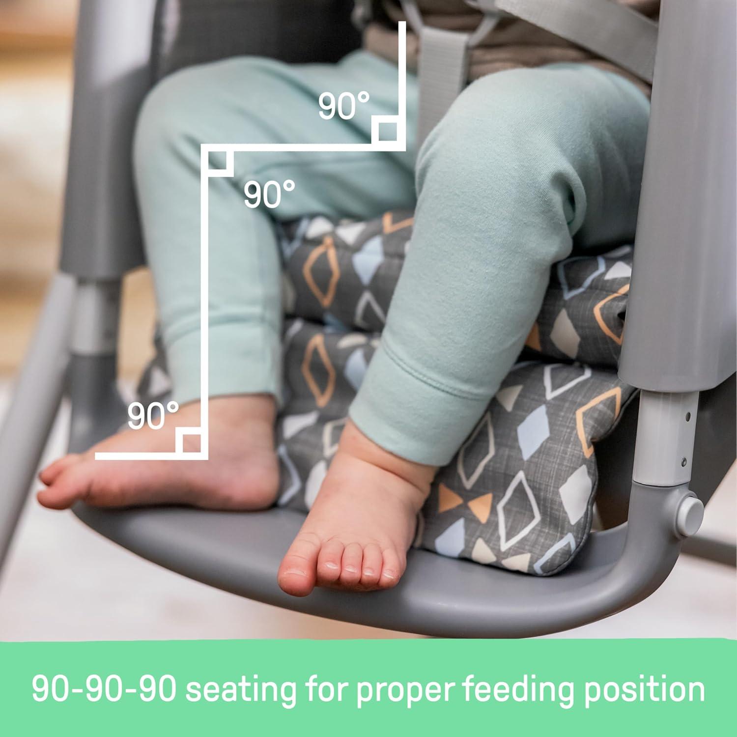 The Ingenuity Proper Positioner 7-in-1 patent-pending high chair features 7 grow-with-me stages of feeding and promotes good posture to encourage better digestion from newborn to toddler. The first 2 features cater to baby's early stages: the full-tilt recline mimics mom's hold for bottle feeding, while Ingenuity's first-ever removable rocking infant seat keeps baby calm. When your little one is ready for bigger bites, the Proper Positioner moves from a traditional high chair to an up-to-table seat and a chair top high chair. This 7-in-1 transforms into a toddler high chair and transitions into a booster, perfect for restaurant dining. The ergonomic design helps with postural stability while the multi-position, adjustable footrest prevents dangling feet and offers added comfort to let baby focus on mealtime. 90/90/90 seating design keeps baby’s legs optimally positioned at a 90-degree angle to promote comfort and proper posture. Machine washable seat pad and insert. Keep baby safe with the 5-point safety harness until used as a toddler chair, then use with the 3-point harness. Third party safety tested and approved. Assembled dimensions: 35'' (L) x 24.5'' (W) x 45.5'' (H).
