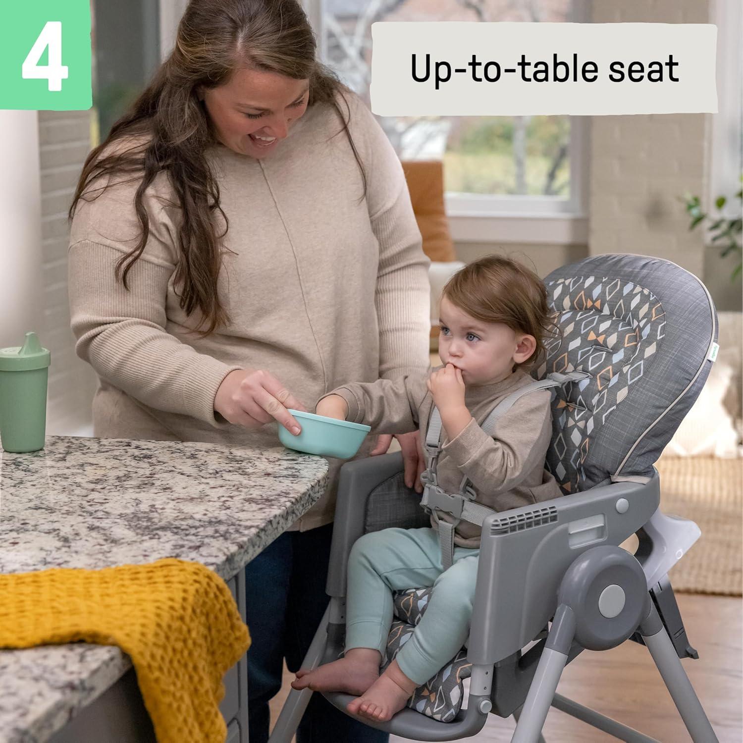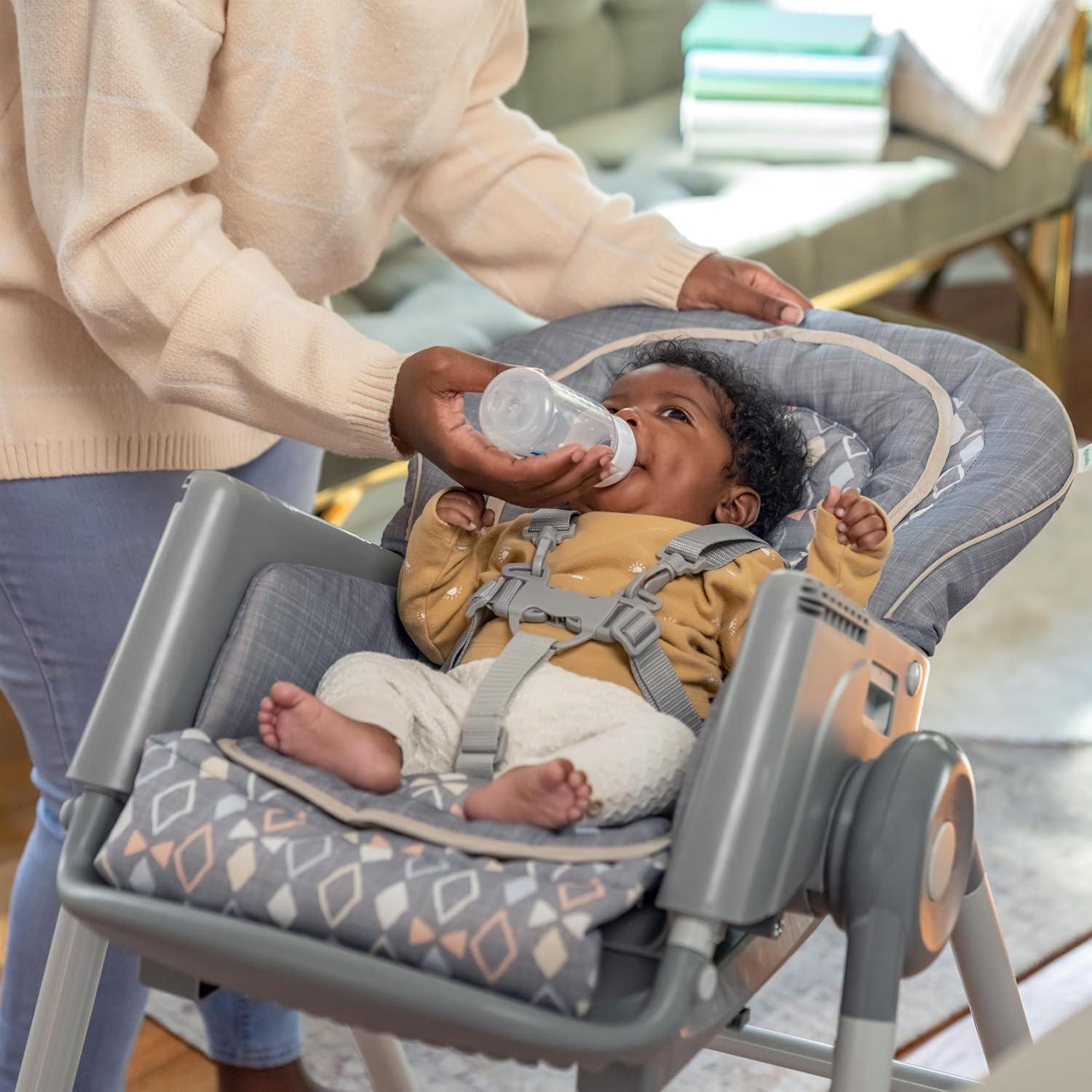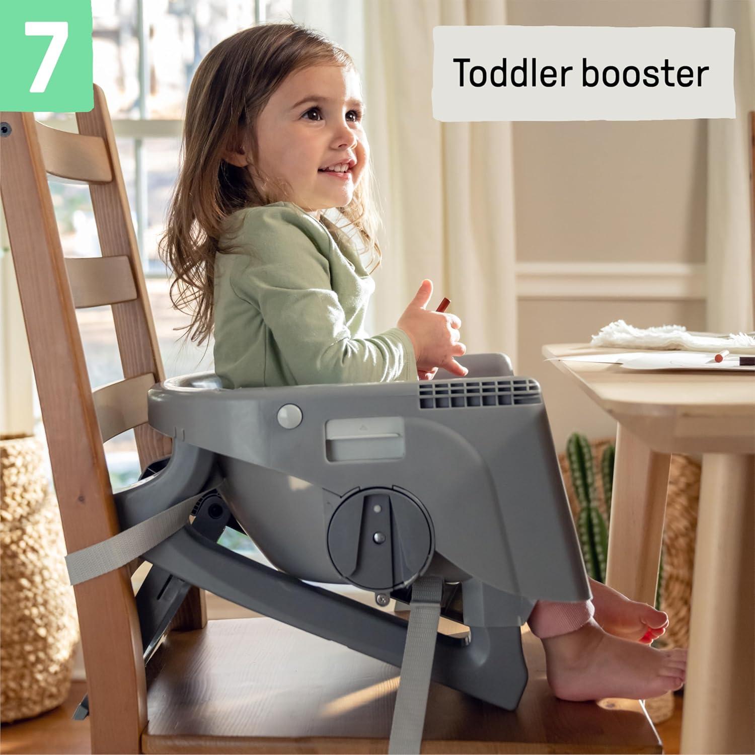 The Ingenuity Proper Positioner 7-in-1 patent-pending high chair features 7 grow-with-me stages of feeding and promotes good posture to encourage better digestion from newborn to toddler. The first 2 features cater to baby's early stages: the full-tilt recline mimics mom's hold for bottle feeding, while Ingenuity's first-ever removable rocking infant seat keeps baby calm. When your little one is ready for bigger bites, the Proper Positioner moves from a traditional high chair to an up-to-table seat and a chair top high chair. This 7-in-1 transforms into a toddler high chair and transitions into a booster, perfect for restaurant dining. The ergonomic design helps with postural stability while the multi-position, adjustable footrest prevents dangling feet and offers added comfort to let baby focus on mealtime. 90/90/90 seating design keeps baby’s legs optimally positioned at a 90-degree angle to promote comfort and proper posture. Machine washable seat pad and insert. Keep baby safe with the 5-point safety harness until used as a toddler chair, then use with the 3-point harness. Third party safety tested and approved. Assembled dimensions: 35'' (L) x 24.5'' (W) x 45.5'' (H).