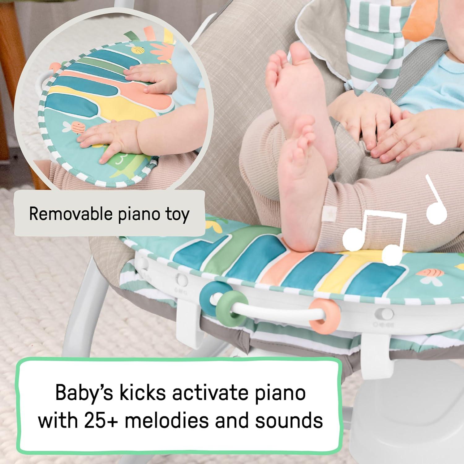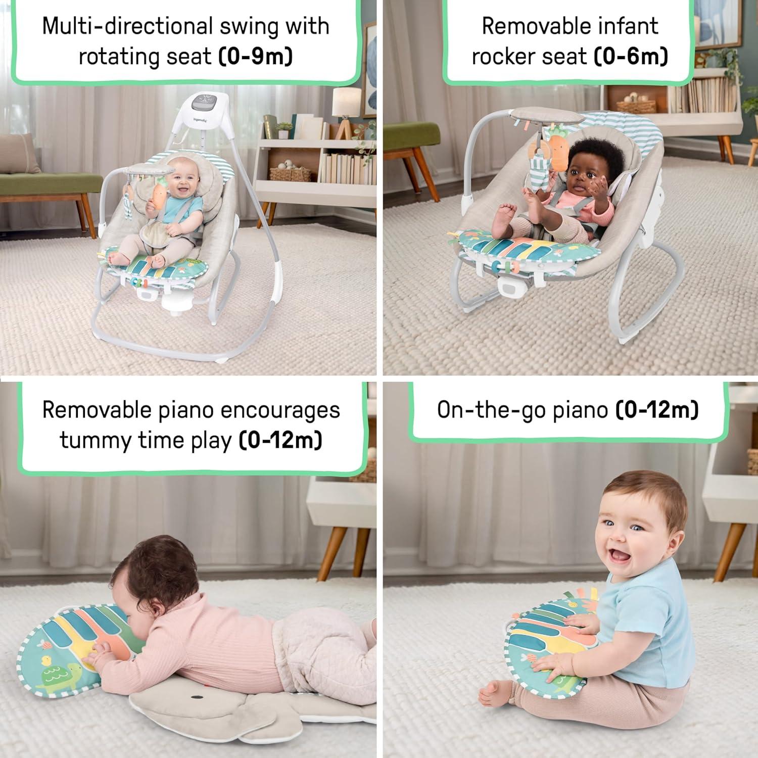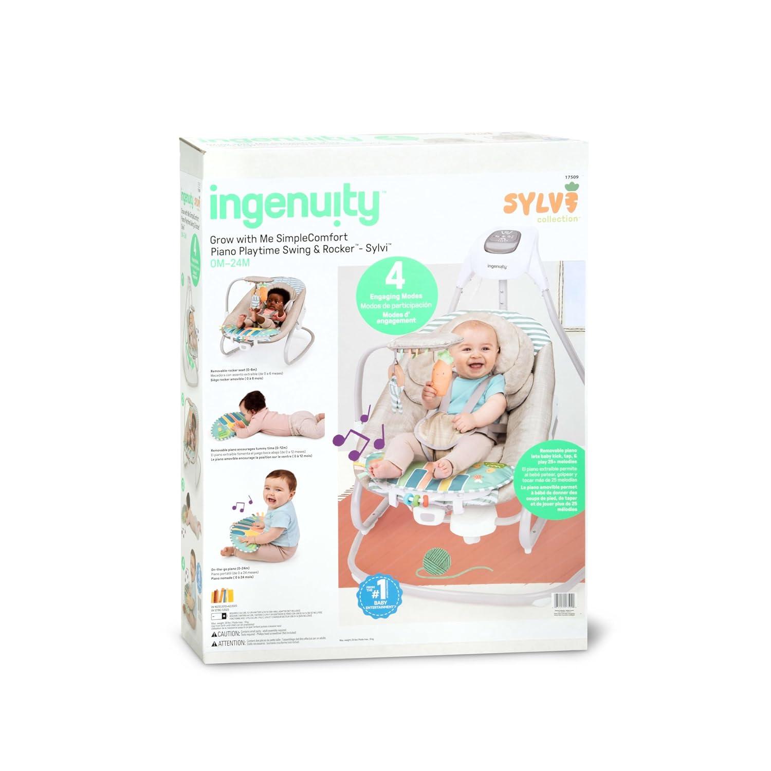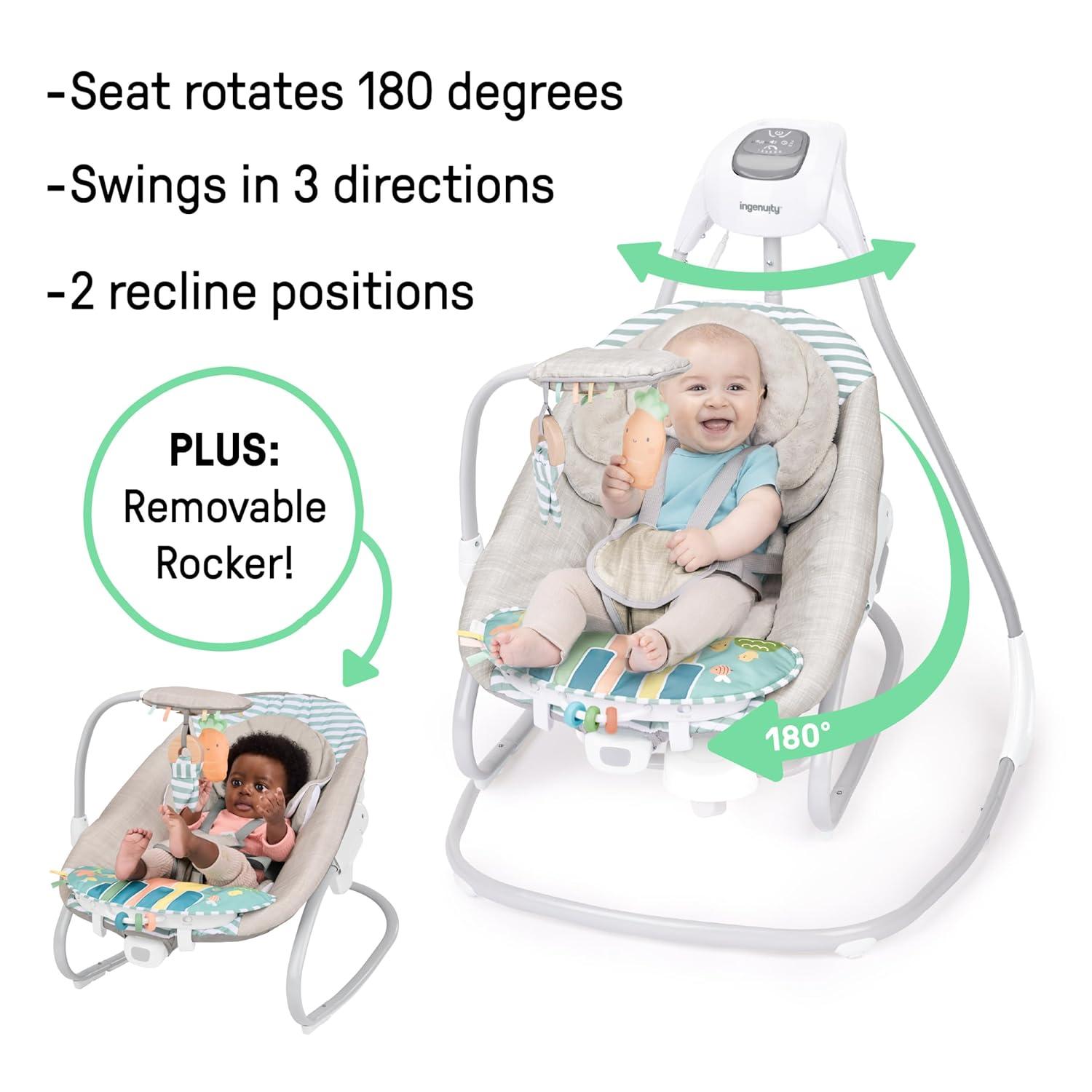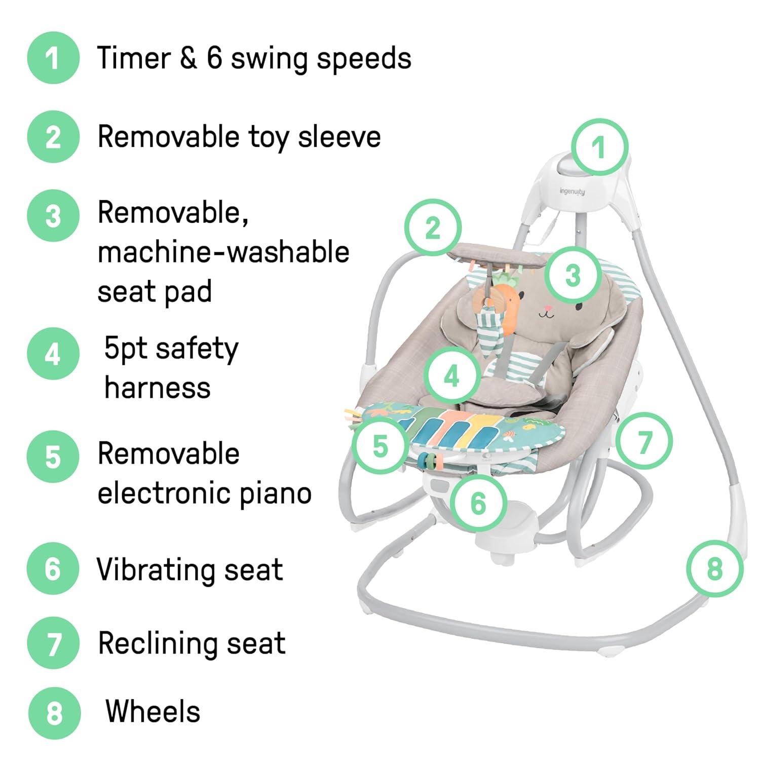 Designed for baby’s ultimate comfort, the Ingenuity SimpleComfort Compact Soothing Swing – Cassidy helps make your day easier. This innovative, oversized seat with adjustable recline is a must-have for new parents, designed in the USA by the #1 Manufacturer of Baby Entertainment*. This swing features 3 swing directions and a seat that rotates 180 degrees. The GentleTouch control panel lets you customize baby's soothing. The overhead mobile features 2 engaging plush characters, a flower and birdie. Baby can enjoy up to 30 minutes of soothing vibrations, and the full-size swing has a 30-, 45-, or 60-minute timer, with auto shut-off after 2 hours. Baby can enjoy up to 20 minutes of soothing melodies, and parents can select high or low volume. Easy care fabric is machine washable for easy cleaning. Included USB cord powers the swing motion and music. 1 C battery powers the vibration unit (AC adaptor and batteries not included). Vibration unit battery is located at the base of the swing in a separate compartment, and the cover can easily be removed. (*Circana, Retail Tracking Service, U.S., Entertainment products, dollar sales, Jan-Nov 2023 combined)